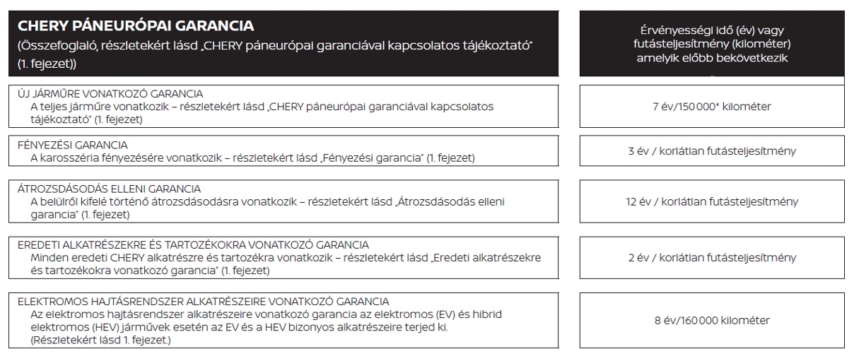 A Chery garantálja, hogy minden új jármű a gyártó szigorú minőségi előírásainak megfelelően készül, és kiszállítás előtt alapos ellenőrzésen esik át. Amennyiben a garanciális időszak alatt, gyártási eredetű hiba merül fel, azt a Chery Centrumban, mint hivatalos Chery szervizműhelyben, díjmentesen javítjuk, alkatrész- és munkadíj felszámítása nélkül.